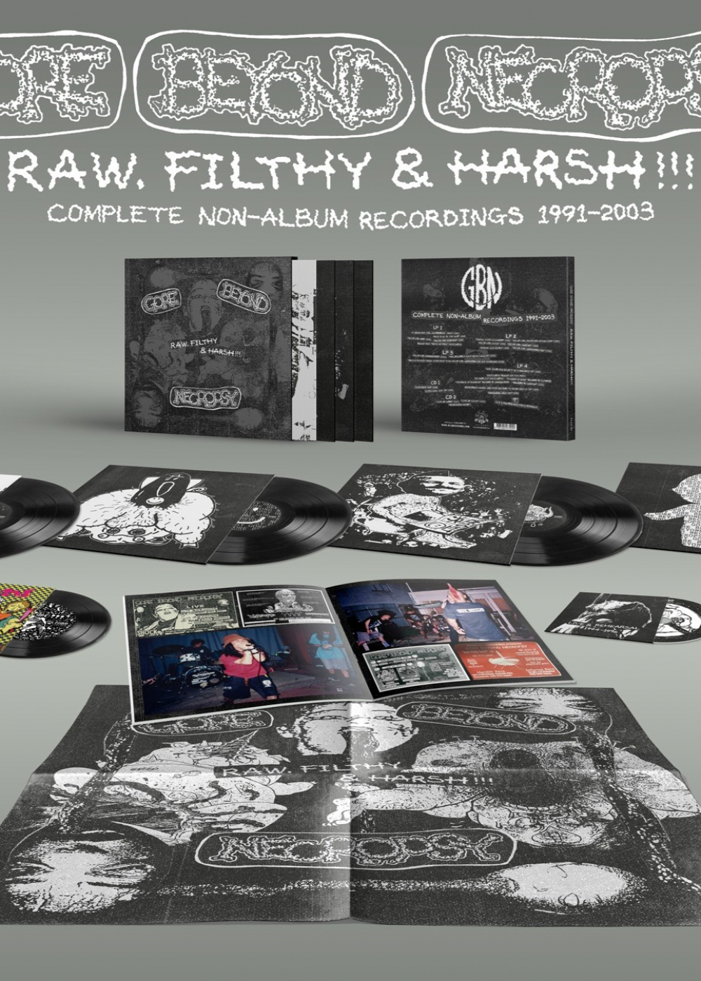Z nejšpinavějších útrob japonské extrémní scény se vynořilo album Gore Beyond Necropsy v děsivé bouři s jedněmi z nejodpornějších a nejzvrhlejších noisegrindů, jaké kdy lidská mysl vymyslela. Toto monstrózní dílo (282 skladeb!) shrnuje všechny jejich nealbumové zvěrstva z let 1991 až 2003, od jejich industriálních gore začátků až po scatologií posedlé fuzz inferno, kterým jsou dobře známí. „Syrové, špinavé a drsné!!!“ se skládá ze 4 LP desek, které obsahují všechna jejich dema, EP, splity, kompilační skladby a super vzácné jediné nahrávky od vedlejšího projektu GBN, REPULTURID MANGEL... plus 2 CD s živými a vzácnými studiovými skladbami, plus 7" repliky posledního EP kapely, šíleného psychedelického tripu s názvem „Wild & frantic!“. Rock'n'rollový speciál!!!". Baleno v luxusním ultra silném pouzdře s masivním plakátem a 54stránkovou knihou obsahující hromadu vzácných fotografií, letáků, úryvků z fanzinu a skenů původních vydání... Připravte si mozky na maraton syrového, špinavého a drsného noisegrindu!